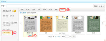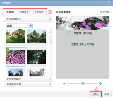 三、在DIY信纸中,您可以对主题图,标题背景,正文背景进行自定义设计,之后点击确定即可(您所编辑的信纸会自动保存在自定义=》我设计的信纸中);