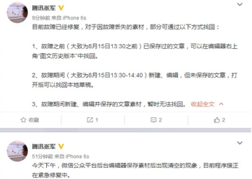 腾讯公关总监张军中午14:40在微博表示,“今天下午,微信公众平台后台编辑器保存素材后出现清空的现象,目前程序猿正在紧急修复中。”