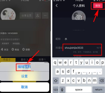 2)然后点击【编辑资料】,接着在点击“抖音ID”,并编辑自己所想的ID号后再点击【保存】即可修改。切记,抖音ID现只能修改一次哦~小伙伴们在修改之前可一定要想清楚。(如下图)