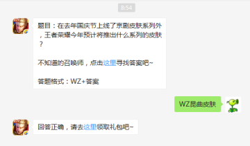 题目:在去年国庆节上线了京剧皮肤系列外,王者荣耀今年预计将推出什么系列的皮肤?答题格式:wz+答案,今天的王者荣耀答案游戏园小编为大家整理好了,希望对玩家获得微信额外的奖励有帮助,不清楚8月19日王者荣耀游戏每日一题答案的玩家速来看看,希望对大家获得腾讯微信免费发放的奖励有帮助。ps:每天都有活动福利,奖励直接发送游戏邮件中,喜欢王者荣耀的朋友一起拿每日一题奖励吧!