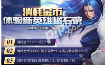 每天消耗3000金币就可以获得橘右京体验卡+15个铭文碎片,体验卡是1天的,不过这个活动是重置的,活动时间从8月30日到9月4日,也就是接下来每6天花3000金币,都可以换一次体验卡,不过这样获得的橘右京不是永久的。
