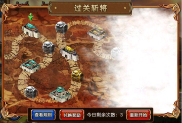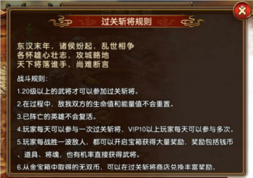 过关斩将规则:20 级以上的武将才可参加战斗,过程中敌我双方的生命值和能量值不会重置,玩家每日可以参与一次过关斩将,VIP10 以上的玩家可以参与多次,玩家每通过一个关卡,可开启宝箱获得奖励。