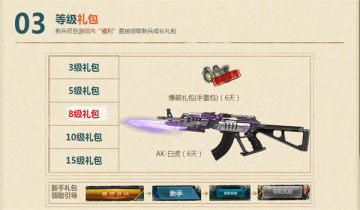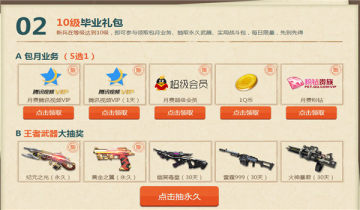 2.10级毕业礼包新兵在等级达到10级,即可参与领取包月业务、抽取永久武器、实用战斗包,每日限量,先到先得。