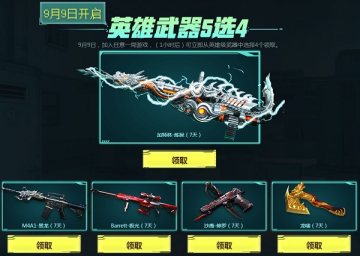 9月9日,加入任意一局游戏,(1小时后)可立即从英雄级武器中选择4个领取。