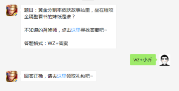 题目:黄金分割率皮肤故事站里,坐在程咬金隔壁看书的妹纸是谁?答题格式:wz+答案,今天的王者荣耀答案游戏园小编为大家整理好了,希望对玩家获得微信额外的奖励有帮助,不清楚8月31日王者荣耀游戏每日一题答案的玩家速来看看,希望对大家获得腾讯微信免费发放的奖励有帮助。ps:每天都有活动福利,奖励直接发送游戏邮件中,喜欢王者荣耀的朋友一起拿每日一题奖励吧!