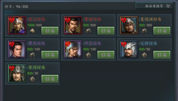 1、武将的品质分为绿色、蓝色、紫色、橙色、红色5个品质,品质主要影响该武将我初始属性和成长值的高低。武将可以通过以下途径获得a、通过酒肆直接招募获得武将b、通过通关副本关卡获得武将好感,积累足够的好感招募对应武将c、在市场中使用信物兑换武将好感,积累足够的好感招募对应武将。