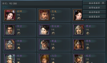 2、在主界面下方菜单栏中点击“武将”,即进入武将列表页面。该页面将会默认以武将品质为依据,由高到低展示玩家所拥有的武将谋士。点击右上方向下箭头,可将武将卡按不同方式(品质、等级、兵种、国家)排序,已经在队伍中的武将会始终置顶显示。