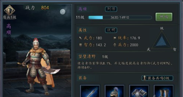3、点击武将头像可查看该武将的详情,并对武将进行升级、升星和穿戴装备等操作。游戏中武将和谋士的属性种类非常丰富,其中阵型、兵种和技能是不可变更的基础设定,武力、智力、统帅、兵力等属性可以通过升级升星来增加。