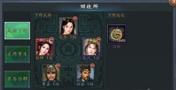 当玩家手里有多余没用的武将或者是进行武将的更新迭代时,在回收所分解或者重生武将是一个很好的去处。分解完整的武将将获得信物、经验书以及升星过程中消耗的材料。武将品质越高,分解获得的信物越多,经验书及升星材料受武将培养情况影响。重生武将将获得经验书、升星过程中的消耗材料以及初始状态的该武将。分解和重生过后武将穿戴的装备都会自动卸下并放入背包中。