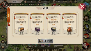 点击城池进入行营,行营中有四块自由地,我们分别将伐木场、炼铁厂、采石场和磨坊间在上面,在屯田中使用政令进行屯田,屯田可获得大量资源,然后建造居民、仓库,提升税收和资源库存上限。
