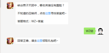 题目:峡谷男子天团中,哪名英雄没有露脸?答题格式:wz+答案,今天的王者荣耀答案游戏园小编为大家整理好了,希望对玩家获得微信额外的奖励有帮助,不清楚9月6日王者荣耀游戏每日一题答案的玩家速来看看,希望对大家获得腾讯微信免费发放的奖励有帮助。ps:每天都有活动福利,奖励直接发送游戏邮件中,喜欢王者荣耀的朋友一起拿每日一题奖励吧!