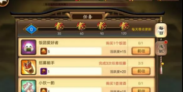 完成每日任务中的“饭团爱好者”和“小饮一盅”分别能获得5小判,“月卡返利”和“至尊卡返利”分别可以领取100和200小判。同时日活跃度达到30、60、90和120时可以在宝箱内开出20、30、50和100的小判。