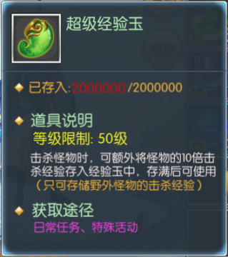 野外挂机是除了经验副本以外,另一个主要获取经验的途径。玩家组队刷怪的话,效率更高。玩家每天有一定的离线挂机时间,使用离线挂机可以关闭游戏后,持续获得经验!并且挂机时候可以同时填满身上的经验玉,经验玉可以储存大量的经验,并且只要花费50元宝,更可以获得8倍的经验收益!性价比超高!!但玩家需要注意的是,击败怪物达到一定的数量,经验获取的倍率会下降哦~