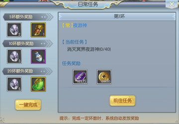每日任务完成可以获得经验和强化石,强化石可以大大地提升玩家战力。并且完成20环还能获得经验玉用于野外挂机。