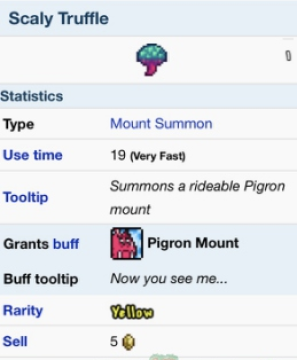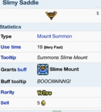 这是一个性价比很高的坐骑,可以从史莱姆王掉落(1/40)。这个坐骑早期开荒的时候很有用。可以跳21个格子,而且可以在水上漂浮,降低掉落伤害,所以综合的移动能力较强,入手简单。当你跳上怪物时,还会造成伤害,这对世界吞噬者和大眼球很有用,因为你可以一直在他们脸上跳造成持续伤害,还可以免疫攻击。