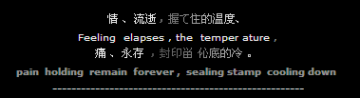 英文版QQ留言代码_Feeling elapses the temper ature 时间:2010/7/22 8:58:00 作者:丫丫 人气:0 效果如下图: 相关推荐:中英文QQ空间情感留言代码_Still can not miss your stop加载全部内容