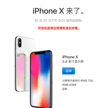 iPhone X分为64G和258G两个版本,iPhone X国行售价从8388元起售,国内10月27日下午3点可以开始接受预订。