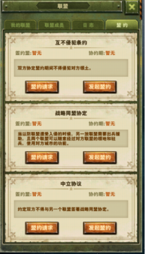 为增加玩家联盟之间的互动,满足大家在战争中对远交近攻、声东击西等外交战术的运用,特别在联盟功能里加入了“盟约”这一全新玩法。下面就让我们用最通俗易懂的语言来解释一下“盟约”的三种形式。