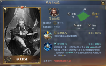 购买奢侈品类商品时,返还部分航海币。 不愧是历史上三角贸易开创者,奢侈品打折,应该是一笔不小的数目吧,喜欢跑商并且主打奢侈品类的玩家,不要错过他咯。