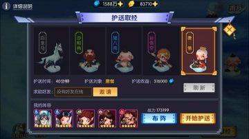 白龙马,蹄朝西,但这里护送唐僧师徒四人取经的就变成了身为小妖的我们啦。每天玩家有3次机会护送取经的机会,每次护送都会刷新出包括白龙马、沙和尚、猪八戒、孙悟空、唐僧在内的五位使者其中之一作为护送对象,护送的使者品质不一,护送需要的时间和收益也不同。同时要注意,其他小妖可在觊觎你的收益,他们会在护送路上随时拦截你,被拦截后不及时反击的话辛苦获得的部分收益就得交给他们咯。不管是联合实力强大的好友保护自己兢兢业业地护送使者,还是去掠夺其他小妖的护送收益,这可都是日进斗金的好生意。