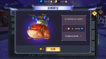 金蟾自古以来就被尊为招财的祥瑞之物,《神仙道2》手游中的金蟾更是身背聚宝盆,大把灵石随身携带。玩家使用少量的灵晶就能跟金蟾兑换大量灵石,如果能够获得称号还能额外增加5%的收益,运气好的话还能获得10倍以内的暴击奖励。但金蟾献宝每天的次数有限,可要抓住机会哦~