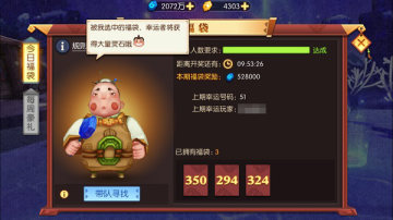 考验运气的时候来了,想体验彩票中奖、一夜暴富的感觉吗?那参加福袋开奖准没错。每个主城中都藏着一些福袋小妖,收服它们有机会获得福袋或者灵石奖励。每天收服小妖最多可以获得10个福袋,到了20点金蟾就会挑选出最喜欢的一个福袋,给予大量灵石奖励。但是金蟾喜欢热闹,参加的人不够多他可不愿意挑选。周日的时候金蟾还会给出当周5组他最喜欢的福袋组合,玩家每集齐一组就能获得百万灵石的奖励。跟着金蟾走,从此灵石有,每天的福袋活动可不要忘了参加。