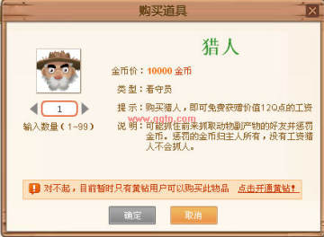 猎人和QQ农场中的狗一样,需要钱买的,10000金币就可以买到了,进你的QQ牧场商店就可以看到,如下图: