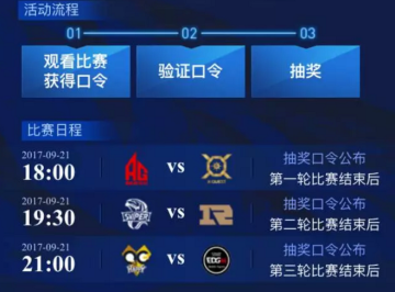 从9月21日18:00开始,每场比赛结束后都会公布抽奖口令,召唤师可以凭着抽奖口令在活动页面内抽取大奖~