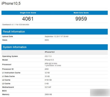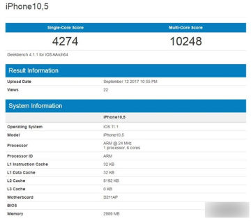 从GeekBench公布的两份跑分数据来看,在iOS 11下A11处理器的成绩可达4061/9959分,而在iOS 11.1下,性能进一步提升,达到了4274/10248分。