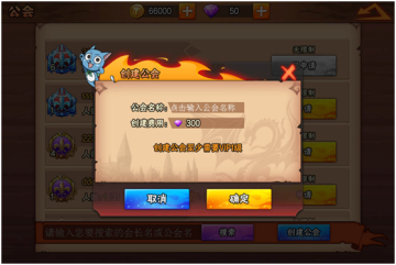 在公会名称中可以输入公会名字,如“妖精的尾巴”。会长的VIP等级必须达到1级,且等级达到20级以上才可创建公会。每创建一个公会均需要花费300钻