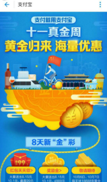 作者:网友整理 人气:0马上就要迎来十一国庆节啦,为此支付宝将推出十一真金周活动,不仅有抽黄金的福利,还有更多优惠好玩的活动哦,赶快随小编一起来看看有关支付宝十一真金周活动的相关介绍吧!