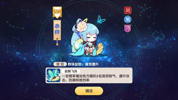小乔手中的折扇飞舞召唤领蝶,为我方全体武将30%概率增加300怒气,30%概率提升攻击,防御和格挡率,提升10%攻击,防御和格挡率
