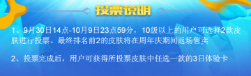 本次限定皮肤投票活动持续时间正好为国庆假期,9月30号到10月9号。只要是10级以上的玩家都可以选择2款皮肤进行投票。