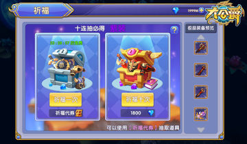 每24个小时可以免费祈福一次,使用【祈福代券】可免费祈福一次,除此之外可消耗200钻石进行一次祈福,或者消耗1800钻石连续祈福10次,祈福10次必得紫装。