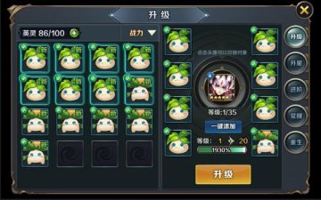 从左侧英灵列表选定一个升级对象,通过吃材料英灵进行升级,其中经验宝宝当做材料,经验宝宝提供的经验较多,产出比较容易。升级时有几率发生经验1.5倍暴击,升级后英灵的属性会得到提升。