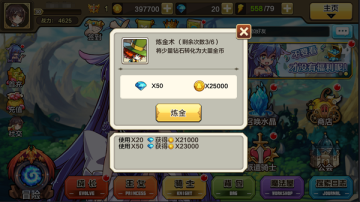 金币第一大来源毋庸置疑便是炼金术,点击金币栏边上的“+”就可以跳出炼金术界面啦,使用少量钻石,可以兑换大量钻石,还有高几率出现高倍数暴击哦~