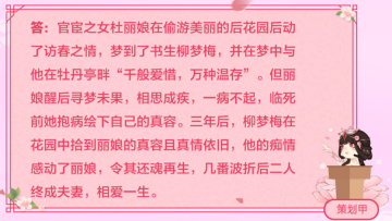 杜丽娘在偷游美丽的后花园后动了春情,梦到了书生柳梦梅,并在梦中与其千般温存,万般爱惜。说白了就是大家闺秀动了春情,但是杜丽娘醒来后却发现梦中情人不再,相思成疾,临死前抱病绘下自己的真容,后续故事可以在上文图片中查看!