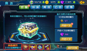 点击主页面的“商店”进入觉醒商店,训练师可以在这里开启觉醒宝箱,每次开启都能得到一枚觉醒碎片,收集到足够多的觉醒碎片后,就能够兑换觉醒武器道具。