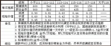 下图(图5:资源对等级换算图)计算了考虑宝石商会损失情况下,精打细算的中R的经验价值。这个经验价值是说,对于精打细算的中R,每晚一天开宝石商会,就会有一天的损失。 如果按照之前的1宝石=3000镔铁=1.5金币计算,晚开一天全部五级宝石商会的损失是600个一级宝石(价值900金币)。那么,如果你每天的经验获取是1000w的话,每1w经验,就意味着0.9金币的宝石获取。 提早开宝石商会,可以免费获得原本必须金币购买的宝石,相当于变相给精打细算的中R升级提供了补贴。在刷城升级的情况下,对4级兵,大概有1粮食=1经验。(只对打NPC守卫有效,打玩家视战斗力的不同而不同,但一般比打NPC的经验少些。遇上强大的超R,1粮食只能获得0.6-0.7经验) 因此,粗略计算,在117级四级宝石商会之前,点券加倍两次买米(1金币=50点券=1.5w米=1.5w经验)都是划算的,建议抓紧冲级。对于有上进心的精打细算的中R,尽快达到119级,金币升级全部宝石商会,是比较合理的选择。祭祀粮食由于价格上限修改为15金币,边际价格较高,并不推荐。