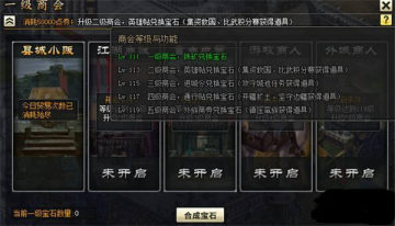 宝石商会里面,一级宝石商会如果不用金币升级,只是起到简化捡宝石操作的作用,没有其他额外收益。而二到五级宝石商会建成后,可以在相应的国家 任务中获得兑换道具。依图1可以看出一级商会需要“镔铁”兑换宝石,二级商会需要“英雄帖”兑换宝石,三级商会需要“进城令”兑换宝石,四级商会需要“通行帖”兑换宝石,五级商会需要“外族商券”兑换宝石。