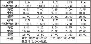 普通活跃玩家每日经验获取大概在1000w左右,强力活跃玩家可以达到1500w。如果大量消费粮食冲级,日经验获取可达2000w。从110级开始,到119级为止,需要如上图表格所示的时间。这真是一个漫长的旅程。