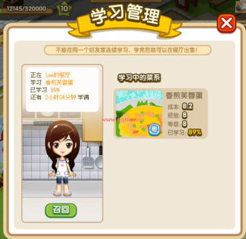 丫丫是起步晚了,所以自己是10级了,现在学习粤菜才到8级,如果你还没有开始学菜的话,赶快行动吧。学习方法很简单,你进入你的好友QQ餐厅,点下面的学艺: