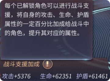 每个已解锁角色会将自身的攻击、生命和护盾属性的一定百分比,加成到战中的角色。