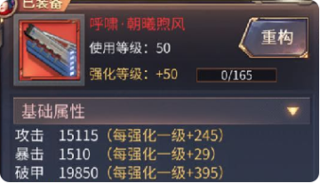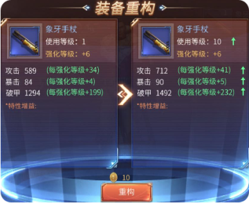 相同条件下,装备的使用等级越高,附加的战力越高,当角色等级高于装备的使用等级10级时,可以通过装备重构,提升装备的使用等级(后续会略降低装备的阶数)。