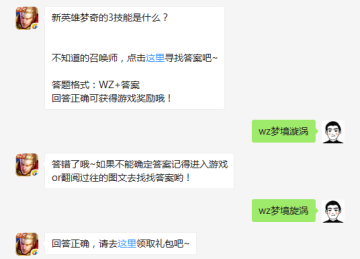 题目:新英雄梦奇的3技能是什么?答题格式:wz+答案,今天的王者荣耀答案小编为大家整理好了,希望对玩家获得微信额外的奖励有帮助,不清楚10月20日王者荣耀游戏每日一题答案的玩家速来看看,希望对大家获得腾讯微信免费发放的奖励有帮助。