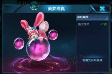 这款皮肤命名为美梦成真,皮肤属性是加120最大生命值,与原始画面不同,皮肤整体呈现出粉红色,就连技能也是粉色的。