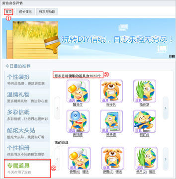二、进入黄钻身份详情页面,在首页中,点击专属道具。之后就能查看到您本月还可领取的道具数量。点击您喜欢的道具,即可领取。如图: