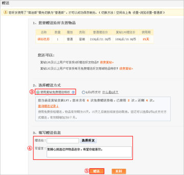 赠送物品数量(不包含黄钻专区物品),不管您赠送给好友的是单件物品还是套装,赠送次数都计算为一次。 |