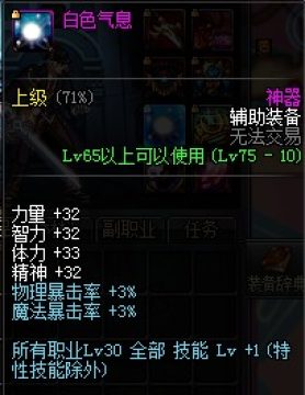 左槽能增加技能等级的装备还是有不少,如果没有好的史诗道具可以直接去刷遗忘之地,1个星期左右就能搜集到2000个七彩转移晶石,然后可以在乔安·费雷诺的商店里面兑换白色气息,属性是所有职业30级技能+1。