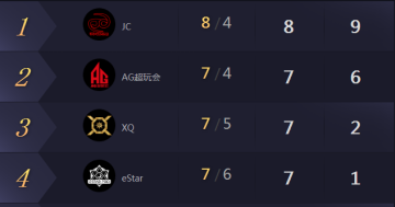 A组排名没有什么大的波动,唯一值得庆幸的是XQ战队,在开局不利的情况下连追多局,现在已经摆脱了掉级的边缘,其他几只战队也都实力强劲,分别是JC,AG超玩会和estar!